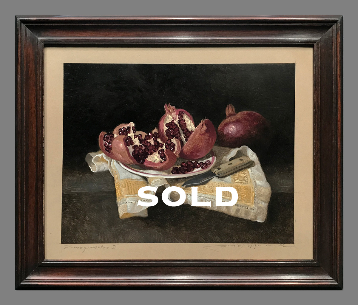 SOLD - Pomegranates II - oil painted drawing - 10.5" x 13" The original drawing is mounted and sealed on a panel, then painted with oils and varnished. Walnut colored frame included - (shipping is free in continental US)